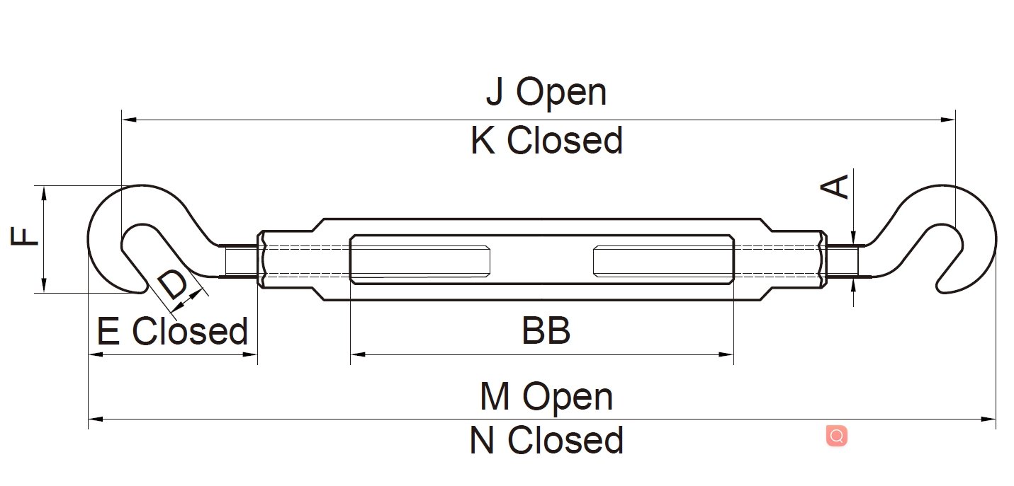 El tensor tipo estadounidense con gancho y gancho, también conocido como tensor americano de doble gancho, es un dispositivo práctico para ajustar la tensión y la longitud de cuerdas, cables, etc. Cuenta con ganchos en ambos extremos y su estructura abierta facilita el colgado rápido de diversos objetos, con un manejo cómodo y eficiente. Los materiales principales del cuerpo son comúnmente acero al carbono y acero inoxidable. El acero al carbono está forjado y tratado térmicamente, lo que le confiere alta resistencia y buena tenacidad; el acero inoxidable (como el acero inoxidable 316) ofrece una excelente resistencia a la corrosión. Las exclusivas roscas internas, tanto izquierdas como derechas, permiten ajustar con precisión la distancia entre los dos ganchos girando el cuerpo de ajuste central, lo que permite un control preciso de la tensión. Se utiliza ampliamente en diversos sectores, como la industria, la construcción y la industria naval.