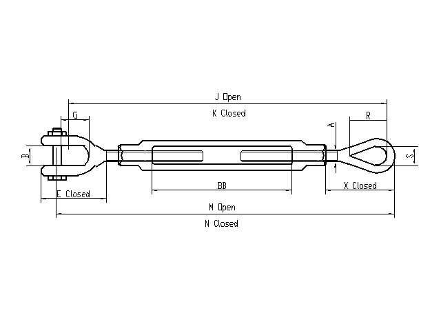 El tensor tipo estadounidense con ojo y mordaza es un dispositivo práctico para ajustar la tensión de cuerdas, cables, etc. Un extremo es un ojo cerrado, que se puede conectar firmemente a la estructura fija mediante pasadores, pernos, etc.; el otro extremo es una mordaza especial, que se puede apretar con pernos para sujetar firmemente diversas cuerdas, varillas, etc. El cuerpo principal está hecho principalmente de acero al carbono de alta calidad, que tiene alta resistencia y buena tenacidad después del tratamiento de forjado, temple y revenido; algunos productos están hechos de acero inoxidable 316, que tiene una excelente resistencia a la corrosión. Las exclusivas roscas internas izquierdas y derechas permiten al operador ajustar con precisión la distancia entre los dos extremos girando el cuerpo de ajuste central para lograr un control preciso de la tensión. Es ampliamente utilizado en la industria, la construcción, la construcción naval y otros campos.