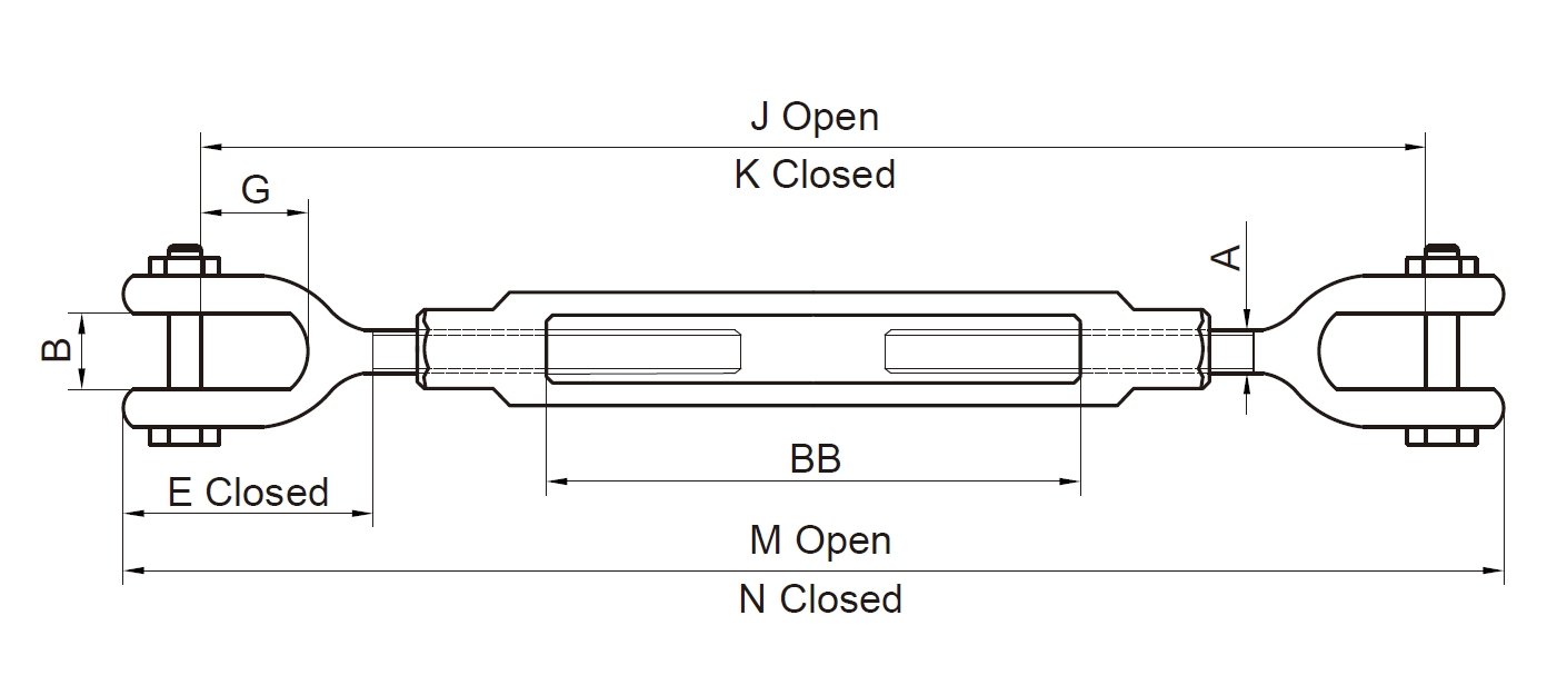 El tensor de mordaza tipo estadounidense, también conocido como tensor de doble mordaza, es un dispositivo práctico para ajustar la tensión y la longitud de cuerdas, cables, etc. Cuenta con una estructura especial de mordaza en ambos extremos, que se puede fijar con pernos para sujetar firmemente diversas cuerdas, varillas, etc., con una conexión firme y sin deslizamientos. El material del cuerpo principal suele ser acero al carbono de alta calidad (como el acero 1045), forjado, templado y revenido para mejorar considerablemente su resistencia y tenacidad; algunos productos de alta gama utilizan acero inoxidable 316, que tiene una excelente resistencia a la corrosión. Las exclusivas roscas internas, tanto izquierdas como derechas, permiten al operador ajustar con precisión la distancia entre los dos extremos girando el cuerpo de ajuste central para lograr un control preciso de la tensión. Se utiliza ampliamente en muchos campos, como la industria, la construcción y la industria naval.