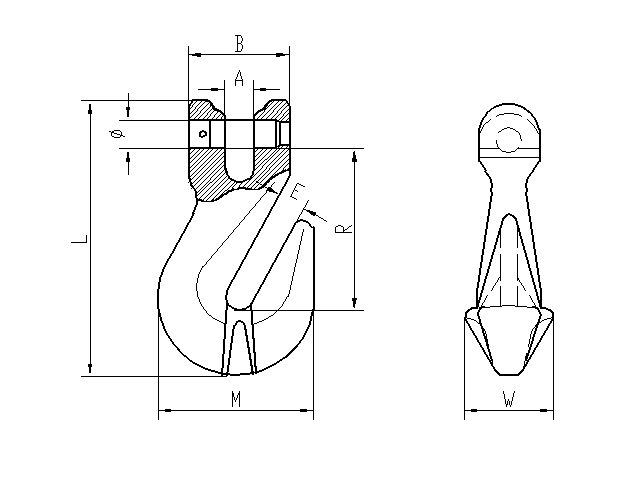 El gancho de agarre acortador de horquilla G100 está forjado en acero de aleación G100 de alta calidad y templado y revenido. Su diseño curvo y estrecho facilita el agarre, acortamiento o fijación rápidos de la cadena, evitando que se salga. Su estructura en forma de horquilla se puede conectar directamente a la cadena G100, y algunos están equipados con pasadores de seguridad. Existen diversas especificaciones, como 8 mm (5/16"), 9 mm (3/8"), etc. La carga límite de trabajo varía según la especificación, y el factor de seguridad de diseño es generalmente de 4:1. Se utiliza comúnmente en operaciones de elevación y montacargas en la construcción, la manufactura y otras industrias.
