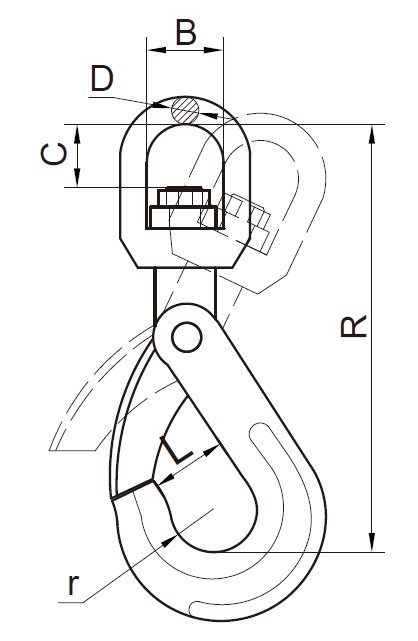 El gancho se bloquea automáticamente al estar bajo tensión y la lengüeta de autobloqueo se cierra herméticamente para evitar que la carga se caiga accidentalmente. Si es necesario liberar la carga, debe desbloquearse manualmente para garantizar una operación segura.
