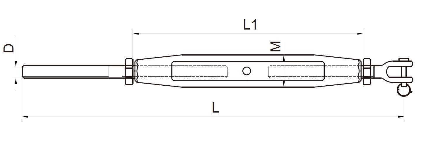Cuerpo de ajuste tubular: El cuerpo principal es un tubo de acero sin costura de alta precisión (materiales comunes: acero al carbono, acero inoxidable 304, acero inoxidable 316), y la pared interior está roscada a izquierda y derecha, que se acoplan a las varillas roscadas en ambos extremos, respectivamente. Al girar el cuerpo de ajuste, la longitud total se puede acortar o alargar para ajustar la tensión.