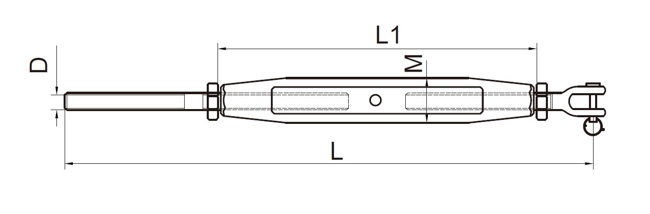 Cuerpo de ajuste tubular: El cuerpo principal es un tubo de acero sin costura de alta precisión (materiales comunes: acero al carbono, acero inoxidable 304, acero inoxidable 316), y la pared interior está roscada a izquierda y derecha, que se acoplan a las varillas roscadas en ambos extremos, respectivamente. Al girar el cuerpo de ajuste, la longitud total se puede acortar o alargar para ajustar la tensión.