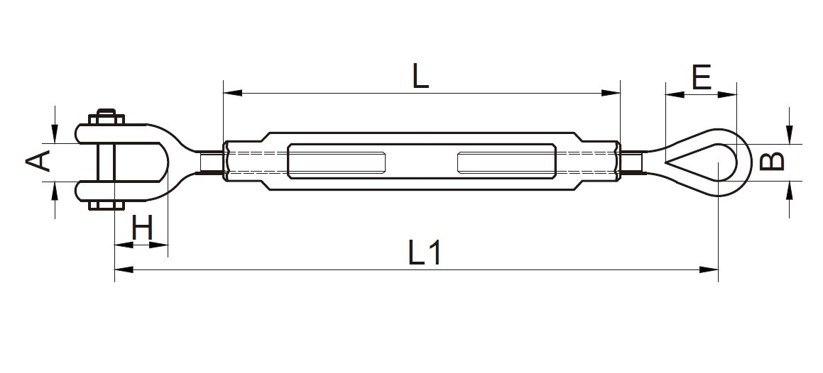El tensor tipo estadounidense es un dispositivo de ajuste de tensión que cumple con las normas estadounidenses. Consta de una varilla roscada a izquierdas, una varilla roscada a derechas y un manguito de ajuste intermedio. Las varillas roscadas en ambos extremos se extienden y retraen simultáneamente girando el manguito para ajustar con precisión la tensión del cable. Los materiales utilizados son principalmente acero al carbono de alta resistencia, acero inoxidable 304 y acero inoxidable 316. El acero al carbono galvanizado es adecuado para entornos industriales secos, el acero inoxidable 304 es adecuado para entornos húmedos comunes y el acero inoxidable 316 está diseñado para entornos altamente corrosivos como océanos y productos químicos. Se utiliza ampliamente en maquinaria de elevación, amarre de barcos, construcción y otros sectores con requisitos estrictos de control de tensión.