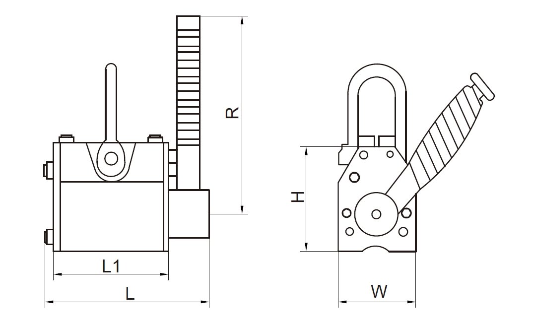 La pinza de elevación magnética JP1 es una pinza de elevación magnética, también conocida como elevador de ventosa magnética. Utiliza materiales magnéticos permanentes de alto rendimiento y absorbe materiales ferromagnéticos como placas de acero y bloques de hierro para su elevación y transporte. Ofrece una estructura compacta, una gran capacidad de adsorción, un manejo sencillo, no requiere alimentación y posee una fuerza magnética permanente. Su diseño de ranura en V inferior permite levantar acero redondo y placas de acero, con un alto factor de seguridad y una fuerza de separación máxima de 3,5 veces la fuerza de elevación nominal.